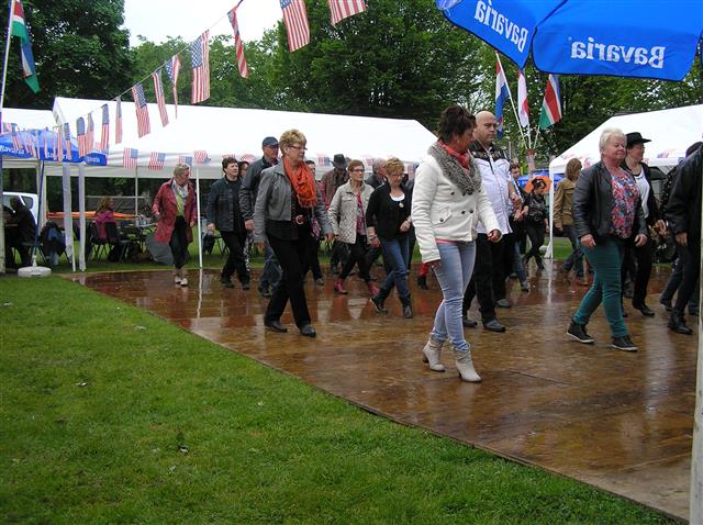 Maar we zitten lekker droog onder de tenten en de dansers gaan gewoon door!